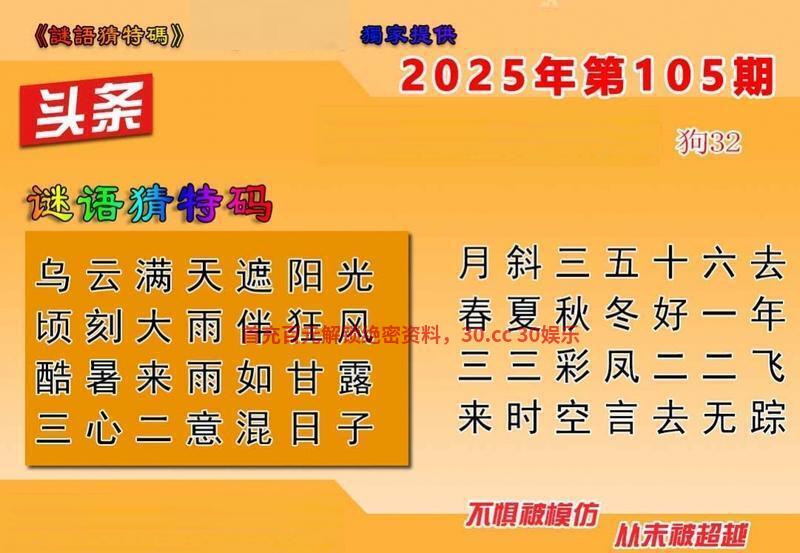105期六合头条【解迷语猜特码】 乌云满天遮阳光 顷刻大雨伴狂风 酷暑来雨如甘露 三心二意混日子 解译:阳光,阳解阳肖,日子解日肖 九肖:龙羊鼠猴猪狗鸡兔马 六肖:龙羊鼠猴猪狗 |