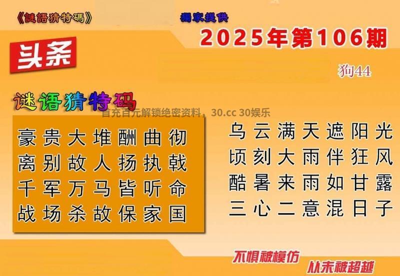 106期六合头条【解迷语猜特码】 豪贵大堆酬曲彻 离别故人扬执戟 千军万马皆听命 战场杀故保家国 解译:大堆,大解大数,家园,家解家禽 九肖:兔虎狗羊牛鸡马猪鼠 |