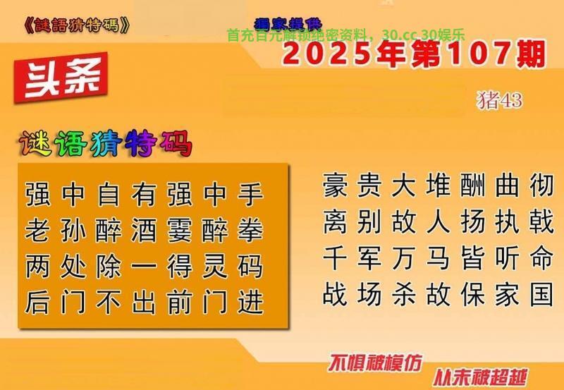 107期六合头条【解迷语猜特码】 强中自有强中手 老孙醉酒霎醉拳 两处除一得灵码 后门不出前门进 解译:老孙,老孙解猴子,前门,前解前肖 九肖:马蛇狗鸡鼠虎牛猪龙 六肖:马蛇狗鸡鼠虎 |