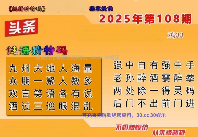 108期六合头条【解迷语猜特码】 九州大地人海量 众朋一聚人数多 欢言笑语各有说 酒过三巡眼混乱 解译:大地,大解大数,三,三解单数 九肖:羊虎狗鼠鸡猴马猪蛇 |
